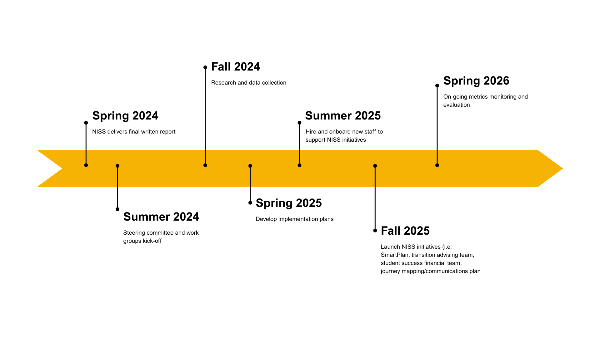 During the 2023-2024 academic year VCU partnered with the National Institute for Student Success (NISS) to conduct a comprehensive assessment of our student success practices. President Rao charged our community with fully implementing the NISS recommendations in an expeditious manner. During the 2024-2025 academic year, an implementation steering committee and seven work groups were launched to implement the playbook recommendations.
